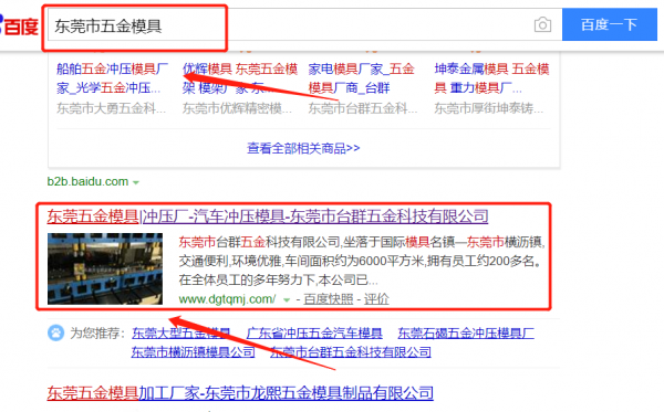 我們公司與東莞市臺(tái)群五金科技有限公司合作中,對(duì)這個(gè)公司所經(jīng)營(yíng)的五金模具這個(gè)行業(yè)提供了百度快照排名,與該公司的合作,更多的客戶讓我們公司為其提供百度快照排名,通過每一次合作,我們公司不斷完善自己,同時(shí)希望合作伙伴在經(jīng)營(yíng)的路上越來越好。