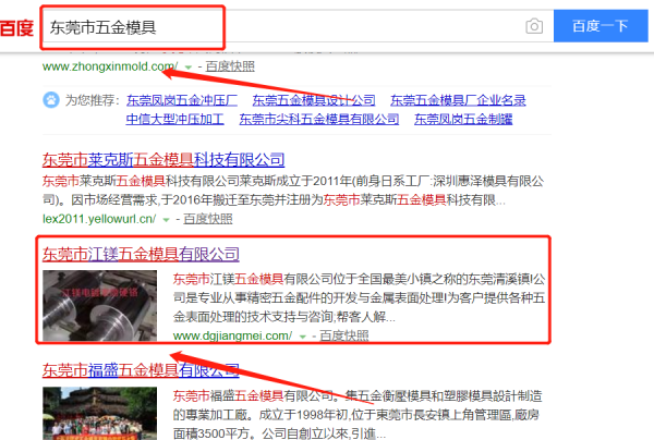 我們公司與東莞市江鎂五金模具有限公司合作中,對這個公司所經(jīng)營的五金模具這個行業(yè)提供了百度快照排名,與該公司的合作,更多的客戶讓我們公司為其提供百度快照排名,通過每一次合作,我們公司不斷完善自己,同時希望合作伙伴在經(jīng)營的路上越來越好。