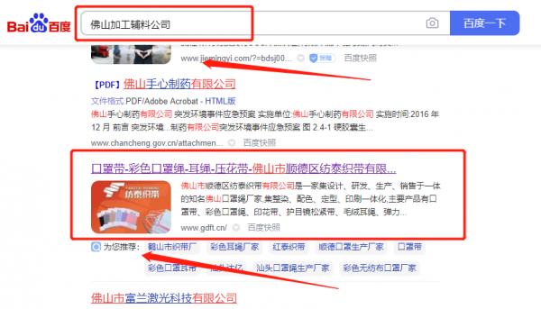 佛山市順德區(qū)紡*織帶有限公司百度排名快上詞效果展示