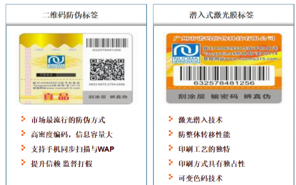 廣州市諾碼防偽科技有限公司是專業(yè)從事企業(yè)信息化產(chǎn)品研發(fā)、生產(chǎn)和銷售的高新技術(shù)企業(yè)。作為國內(nèi)電碼防偽行業(yè)的開拓者、市場引領(lǐng)者和整體解決方案的倡導(dǎo)者,經(jīng)過近十年的精耕細作,我們建立了覆蓋全國的市場銷售和技術(shù)服務(wù)體系,開發(fā)了系列化的中高端防偽產(chǎn)品,以難仿制、易識別的獨占性技術(shù),經(jīng)受住了市場的嚴(yán)酷考驗,獲得了名優(yōu)企業(yè)的廣泛認同和信任。目前,已有各行各業(yè)近千家處于領(lǐng)導(dǎo)地位的跨國公司和國內(nèi)知名企業(yè)選擇使用了我公司的信息化防偽、防竄貨和會員積分管理解決方案和服務(wù)。