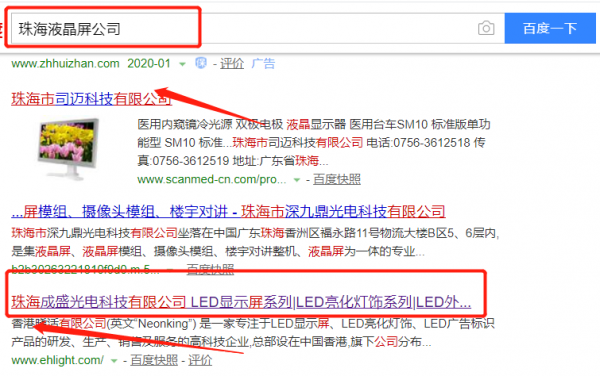 珠海成盛光電科技有限公司選用我司企業(yè)液晶屏的網(wǎng)站優(yōu)化產(chǎn)品,其SEO關(guān)鍵詞有液晶屏。通過對(duì)搜索引擎目標(biāo)關(guān)鍵詞優(yōu)化,使目標(biāo)網(wǎng)站的相關(guān)信息顯示在百度首頁,為企業(yè)挖掘更多的潛在客戶的同時(shí)帶來海量的商機(jī)。珠海成盛光電科技有限公司成立于2011年,是經(jīng)珠海市市場(chǎng)監(jiān)督管理局審核的有資質(zhì)的公司,其統(tǒng)一社會(huì)信用代碼:91440400572444942T。公司地址:廣東省珠海市香洲梅華西路2372號(hào)香洲區(qū)科技工業(yè)區(qū)25號(hào)A棟二樓。