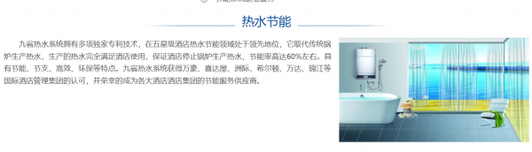 海南九省能源技術有限公司主要從事能源技術、節(jié)能技術的研究和開發(fā);熱水節(jié)能設備、空調節(jié)能設備的安裝、維修及保養(yǎng);能源合同管理的企業(yè)。定位于豪華五星級酒店的節(jié)能服務等,提供能源評估、節(jié)能方案設計、節(jié)能工程實施、合同能源管理、系統(tǒng)維護等全方位的專業(yè)服務。我公司獨立研發(fā)的“九省熱水系統(tǒng)”已獲得了多項專利,還先后獲得了科技部、省科技廳、能源局等相關部門的大力支持。九省系統(tǒng)技術在我國熱水節(jié)能行業(yè)中處于領先水平。公司是三亞市發(fā)改委、工業(yè)與信息化局節(jié)能服務部備案的節(jié)能服務企業(yè),受到政府的大力推廣。目前我公司的九省系統(tǒng)獲得萬豪、喜達屋、洲際、希爾頓、萬達、錦江等國際酒店管理集團的認可,并榮幸的成為各大酒店酒店集團的節(jié)能服務供應商。我公司始終以滿足客戶的需求,成為客戶信賴的長期伙伴為宗旨。努力打造以專業(yè)的技術水平、頂級的服務質量、一流的經濟效益為目標的節(jié)能環(huán)保企業(yè)。