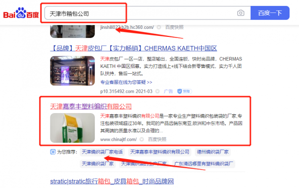 天津*泰豐塑料編織有限公司選用我司企業(yè)箱包的網(wǎng)站優(yōu)化產(chǎn)品,其SEO關(guān)鍵詞有箱包。一對(duì)一定制服務(wù),產(chǎn)品經(jīng)理在線(xiàn)支持,無(wú)憂(yōu)售后,適用于各個(gè)企業(yè),提供一站式網(wǎng)絡(luò)營(yíng)銷(xiāo)服務(wù)。百度搜索引擎優(yōu)化,提升品牌關(guān)鍵詞的正面內(nèi)容信息展現(xiàn),體現(xiàn)良好的口碑宣傳。天津*泰豐塑料編織有限公司成立于2008年,是經(jīng)天津市市場(chǎng)監(jiān)督管理局審核的有資質(zhì)的公司,其統(tǒng)一社會(huì)信用代碼:911202226**702525C。公司地址:天津市武清區(qū)下朱莊街南北辛莊立交橋西側(cè)。