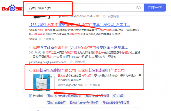 我們公司與石家莊*寶包裝制品有限公司合作中,對這個公司所經(jīng)營的箱包這個行業(yè)提供了優(yōu)化排名,與該公司的合作,更多的客戶讓我們公司為其提供快速排名,通過每一次合作,我們公司不斷完善自己,同時希望合作伙伴在經(jīng)營的路上越來越好。