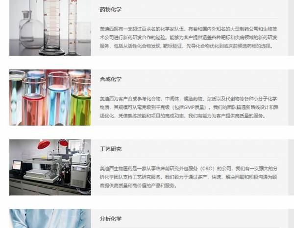 上海美迪西生物醫(yī)藥股份有限公司選用我司企業(yè)中西藥品行業(yè)的網(wǎng)站優(yōu)化產(chǎn)品,其SEO關(guān)鍵詞有 上海生物公司,臨床前研究,CRO公司,藥代動(dòng)力學(xué)服務(wù),藥物篩選服務(wù),藥物化學(xué)服務(wù),藥物安全評(píng)價(jià),毒理學(xué)研究,美迪西,化合物活性篩選,醫(yī)藥研發(fā)外包。其特點(diǎn)是用很合適的展示方式、展示效果、站點(diǎn)框架,把客戶及其用戶很關(guān)心的問(wèn)題突出表現(xiàn);并以簡(jiǎn)潔明朗的設(shè)計(jì)風(fēng)格,清晰展現(xiàn)公司水平實(shí)力,確保一秒抓住目標(biāo)用戶眼球,給用戶留下良好的第一印象。上海美迪西生物醫(yī)藥股份有限公司成立于2004年,是經(jīng)浦東新區(qū)市場(chǎng)監(jiān)督管理局審核的有資質(zhì)的公司,其統(tǒng)一社會(huì)信用代碼:9131000075842961XY 。公司地址:上海市浦東新區(qū)川大路585號(hào)。