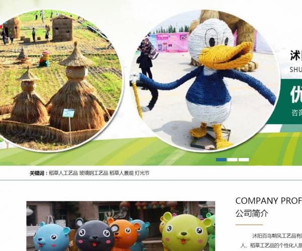 沭陽百鳥*鳳工藝品有限公司專 注于稻草工藝品、玻璃鋼工藝品設(shè)計、開發(fā)。提供基于稻草人、稻草工藝品的個性化人居環(huán)境設(shè)計與定制方案。開發(fā)的產(chǎn)品主要有稻草工藝品、玻璃鋼工藝品、燈光節(jié)展覽相關(guān)制品,生產(chǎn)稻草工藝品產(chǎn)品有普通稻草人、卡通稻草人、農(nóng)耕系列、動物造型、大型動物、稻草雕塑等。