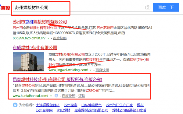 昆泰焊材科技(蘇州)有限公司選用我司企業(yè)焊接材料的網(wǎng)站優(yōu)化產(chǎn)品,其SEO關鍵詞有焊接材料。采用全球領先的關鍵詞三維云計算系統(tǒng),智能關鍵詞報價查詢,徹底杜絕高價、朦朧價。自助提交優(yōu)化任務,自由設定指定關鍵詞,指定排名位置,避免傳統(tǒng)銷售誘導。昆泰焊材科技(蘇州)有限公司成立于2016年,是經(jīng)蘇州市市場監(jiān)督管理局審核的有資質的公司,其統(tǒng)一社會信用代碼:91320506MA1MULB42A。公司地址:江蘇省蘇州市吳中區(qū)長橋街道財智商務廣場2幢601-616號A區(qū)003號工位(集群登記)。
