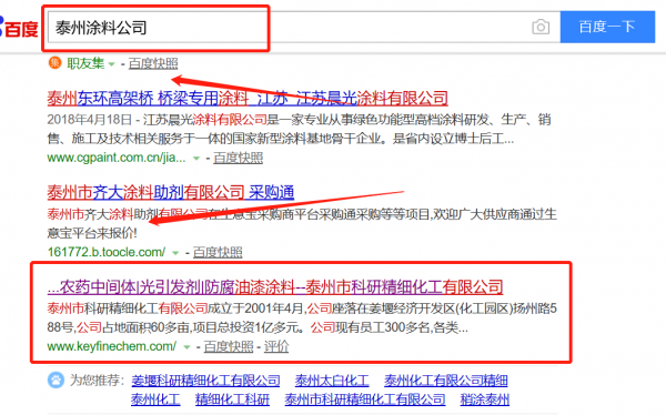 我們公司與泰州市科研精細化工有限公司合作中,對這個公司所經(jīng)營的涂料這個行業(yè)提供了SEO推廣,與該公司的合作,更多的客戶讓我們公司為其提供SEO推廣,通過每一次合作,我們公司不斷完善自己,同時希望合作伙伴在經(jīng)營的路上越來越好。
