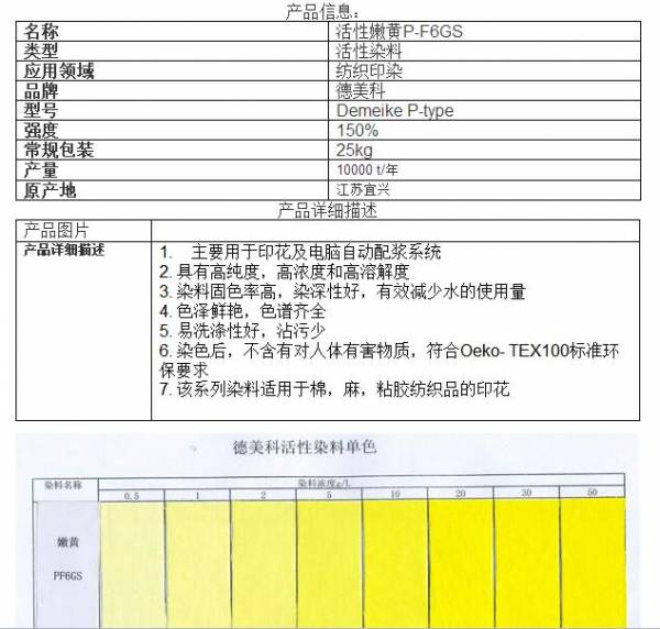 江蘇徳美科化工有限公司位于江蘇省宜興市,成立于2003年,是一家以生產活性染料為主導,集研究、開發(fā)、生產和銷售于一體的公司。經過多年潛心經營,公司主要生產“徳美科”牌活性染料,年產量12000多噸,包括K、KN、M、ME、S、D、W、P等型共100多個品種,色譜齊全,廣泛用于棉、麻、粘膠、羊毛及其混紡織物的浸染、軋染及印花[防印、拔印(雕印)]。“徳美科”牌活性染料屬于環(huán)保型綠色染料,即不含有德國政府和歐共體規(guī)定的在特定條件下會裂介產生22種致癌性芳香胺的偶氮染料,也不含有過敏性染料、致癌性染料和其它對人體和環(huán)境有害的化學物質。在質量管理上,通過了ISO9001,ISO14001 國際質量管理體系認證,Intertek化學品安全環(huán)保測試認證和環(huán)境管理體系認證,并對用戶廠承諾實行質量“三包”。