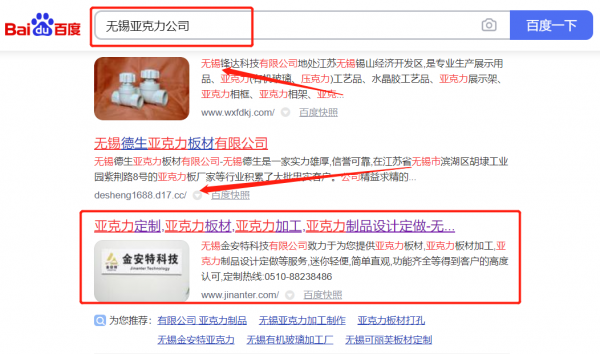 無錫金*特科技有限公司選用我司企業(yè)亞克力的網(wǎng)站優(yōu)化產(chǎn)品,其SEO關(guān)鍵詞有亞克力。關(guān)鍵詞不限點擊次數(shù),大量搜索流量直達官網(wǎng);PC + 手機端搜索首頁自然排名,365天持效穩(wěn)定收錄。無錫金*特科技有限公司成立于2014年,是經(jīng)無錫市市場監(jiān)督管理局審核的有資質(zhì)的公司,其統(tǒng)一社會信用代碼:913202140**7714723。公司地址:江蘇省無錫市新吳區(qū)鴻山街道馬橋工業(yè)園12號。