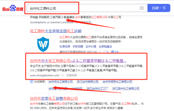 臺州市*大化工有限公司百度關(guān)鍵詞排名排名案例欣賞