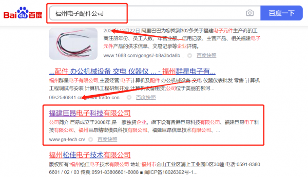 福建巨*電子科技有限公司選用我司企業(yè)電子配件行業(yè)的網(wǎng)站優(yōu)化產品,其SEO關鍵詞有電子配件。海洋網(wǎng)絡互聯(lián)擁有十幾名專業(yè)深圳SEO工程師,文案策劃,海量軟文資源,外鏈團隊和編輯團隊,排名有保障。網(wǎng)站做好以后,我們免費幫您提交熱門搜索引擎,讓百度收錄,并且?guī)湍鷥?yōu)化公司品牌關鍵詞排名福建巨*電子科技有限公司成立于2008年,是經(jīng)福州市市場監(jiān)督管理局審核的有資質的公司,其統(tǒng)一社會信用代碼:91350104**08567250。公司地址:福建省福州市閩侯縣南嶼鎮(zhèn)旗山工業(yè)集中區(qū)8號3號樓1-5。