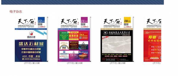 《天下石》雜志為南安*然文化傳播旗下平臺。創(chuàng)刊于2005年10月,為月刊,閩固印廣登號(2015)第01號,國際標(biāo)準(zhǔn)刊號:ISSN2224-3984。因?yàn)榱己玫姆?wù)、前瞻的設(shè)計(jì)理念、豐富的文化內(nèi)涵,尤其是良好的廣告效益而獲得社會(huì)各界的廣泛贊譽(yù),多年來《天下石》已在國內(nèi)石材行業(yè)形成自己的影響力,并擁有眾多忠實(shí)讀者和客戶群體。本刊還得到包括中國石材工業(yè)協(xié)會(huì)、上海石材行業(yè)協(xié)會(huì)、山東省石材行業(yè)協(xié)會(huì)、福建省石材行業(yè)協(xié)會(huì)、廣東省石材行業(yè)協(xié)會(huì)等專家學(xué)者、領(lǐng)導(dǎo)們的一致好評。