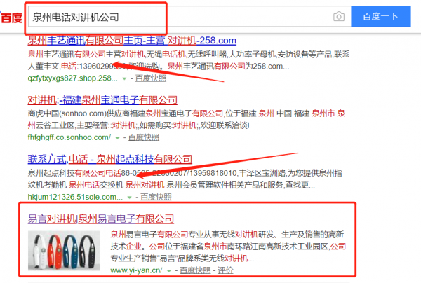 我們公司與泉州易言電子有限公司合作中,對(duì)這個(gè)公司所經(jīng)營(yíng)的電話對(duì)講機(jī)這個(gè)行業(yè)提供了關(guān)鍵詞搜索排名,與該公司的合作,更多的客戶(hù)讓我們公司為其提供關(guān)鍵詞搜索排名,通過(guò)每一次合作,我們公司不斷完善自己,同時(shí)希望合作伙伴在經(jīng)營(yíng)的路上越來(lái)越好。