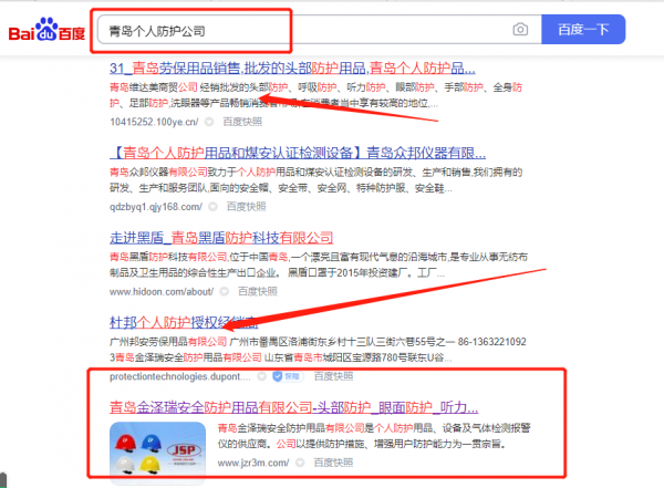 青島金*瑞安全防護(hù)用品有限公司選用我司企業(yè)個(gè)人防護(hù)的網(wǎng)站優(yōu)化產(chǎn)品,其SEO關(guān)鍵詞有個(gè)人防護(hù)。主要針對百度、搜狗、360等搜索引擎進(jìn)行快速排名優(yōu)化服務(wù),關(guān)鍵詞排名必要條件是在搜索結(jié)果前3頁,周期15天內(nèi)可優(yōu)化到搜索引擎首頁。青島金*瑞安全防護(hù)用品有限公司成立于2010年,是經(jīng)青島市市場監(jiān)督管理局審核的有資質(zhì)的公司,其統(tǒng)一社會(huì)信用代碼:913702135**819766T。公司地址:山東省青島市高新區(qū)寶源路780號(hào)聯(lián)東U谷青島國際企業(yè)港18號(hào)樓102戶。