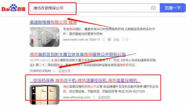 我們公司與濰坊藍(lán)*壓縮機(jī)有限公司合作中,對這個公司所經(jīng)營的改裝維保這個行業(yè)提供了網(wǎng)站SEO優(yōu)化,與該公司的合作,更多的客戶讓我們公司為其提供百度快照排名,通過每一次合作,我們公司不斷完善自己,同時希望合作伙伴在經(jīng)營的路上越來越好。
